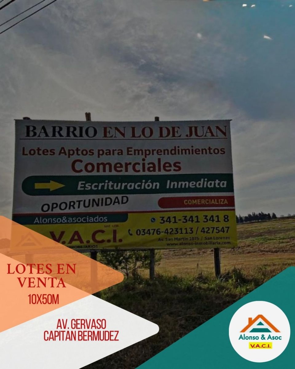 🌟 Descubrí una oportunidad única en Capitán Bermúdez: lotes ideales por su ubicación estratégica sobre una de las avenidas más destacadas de la zona. A tan solo un paso del acceso a la autopista, estos terrenos de 10x50 metros poseen un increíble potencial tanto para desarrollos comerciales como residenciales. 🚀 El Factor de Ocupación del Suelo (FOS) del 1 te permite maximizar cada metro cuadrado de tu inversión, convirtiendo estos lotes en una plataforma versátil y adaptable para tus proyectos más ambiciosos. 🏗️ Imaginá el crecimiento futuro de un emprendimiento que se levanta justo en el corazón de una avenida, con accesibilidad inmejorable y rodeado de un entorno en constante expansión. Es una oportunidad que ofrece tanto visibilidad como conexión, lo cual garantiza que cualquier desarrollo tenga las condiciones necesarias para prosperar. 🌆 Animate a invertir en un futuro próspero, donde la ubicación y el potencial se funden para ofrecerte lo mejor. Tu proyecto soñado te está esperando en estos lotes estratégicamente ubicados en Capitán Bermúdez. 🌟🔑